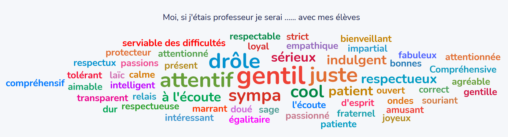 Chaque classe a eu un temps de réflexion, dédié, pour évoquer les notions de liberté d'expression et de laïcité. Ce temps s'est terminé par une projection dans le métier d'enseignant avec la phrase suivante, à compléter : Moi, si j'étais professeur je serai ...... avec mes élèves. Un nuage de mot a été créé.