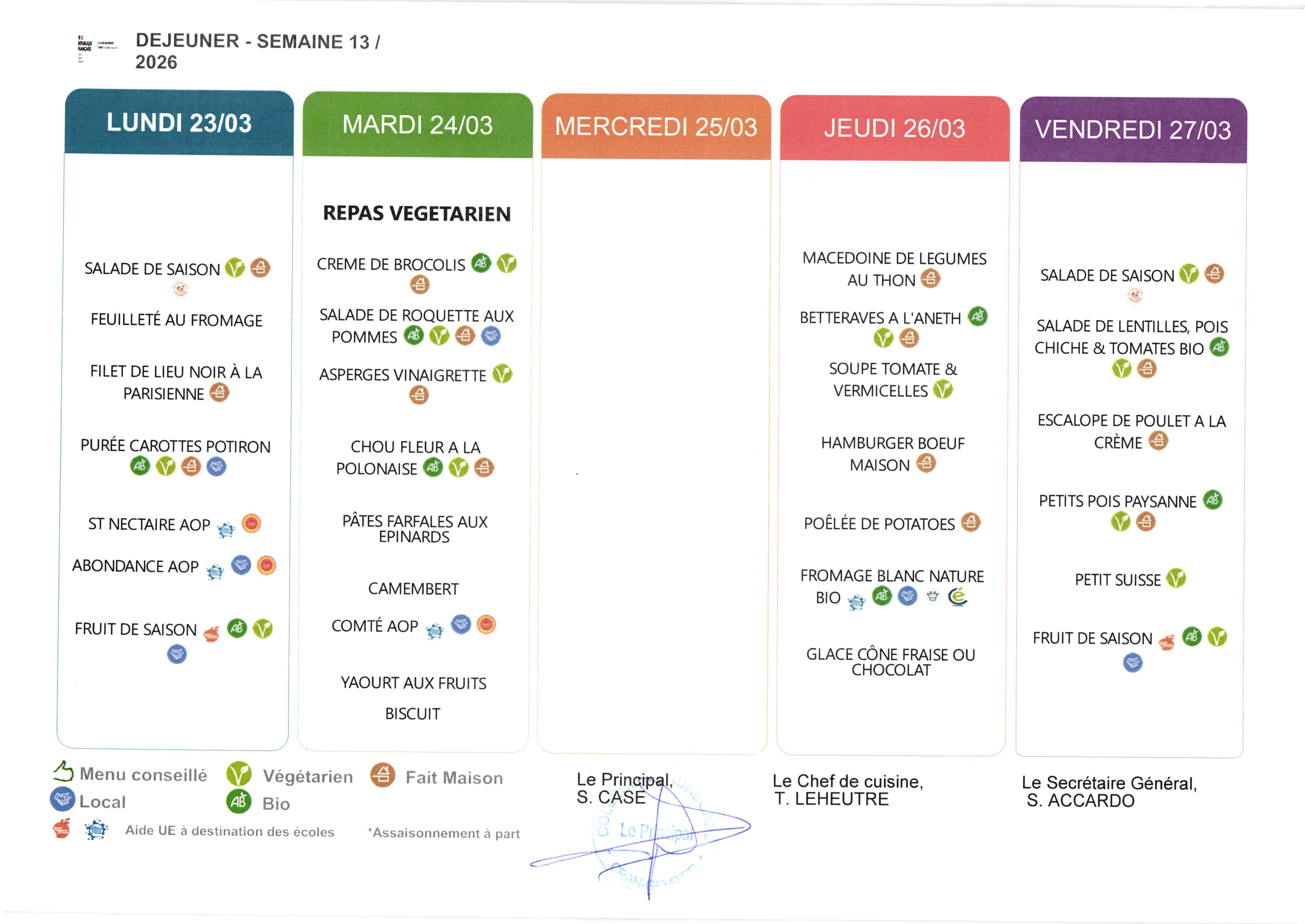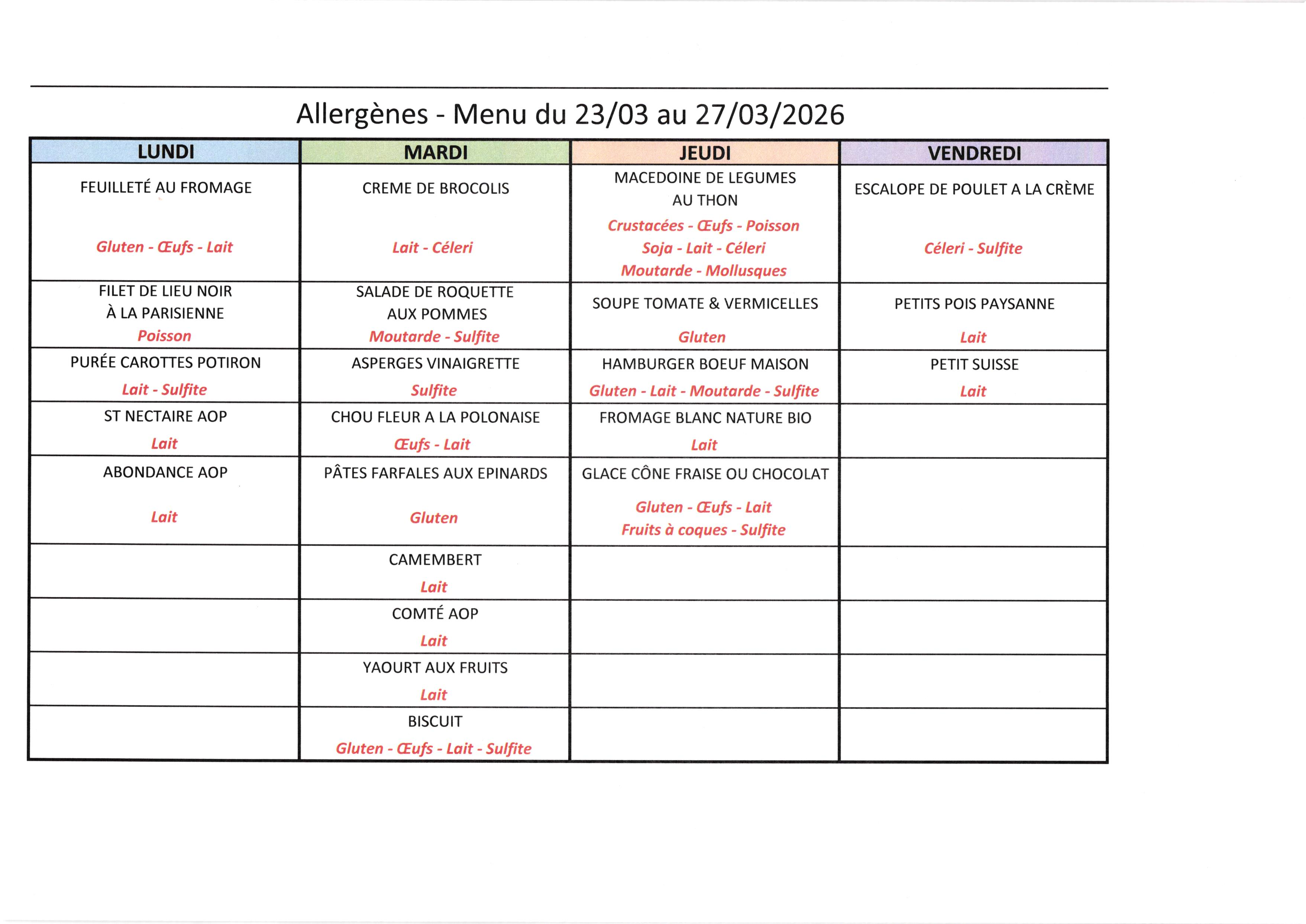 Menu et allergènes du 23 au 26 03 2026