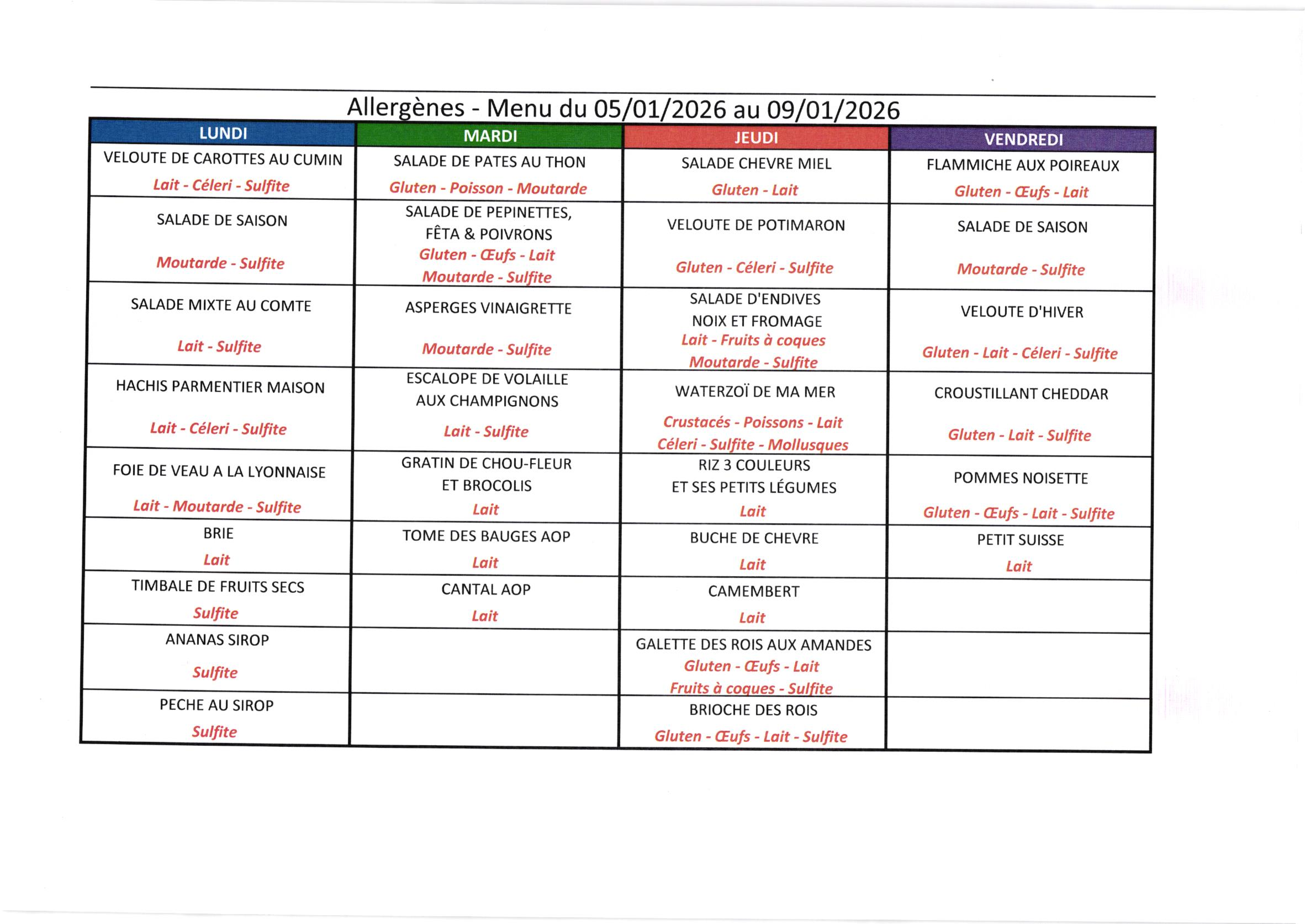 Menu et allergènes Semaine du 05 janvier au 09 janvier 2026