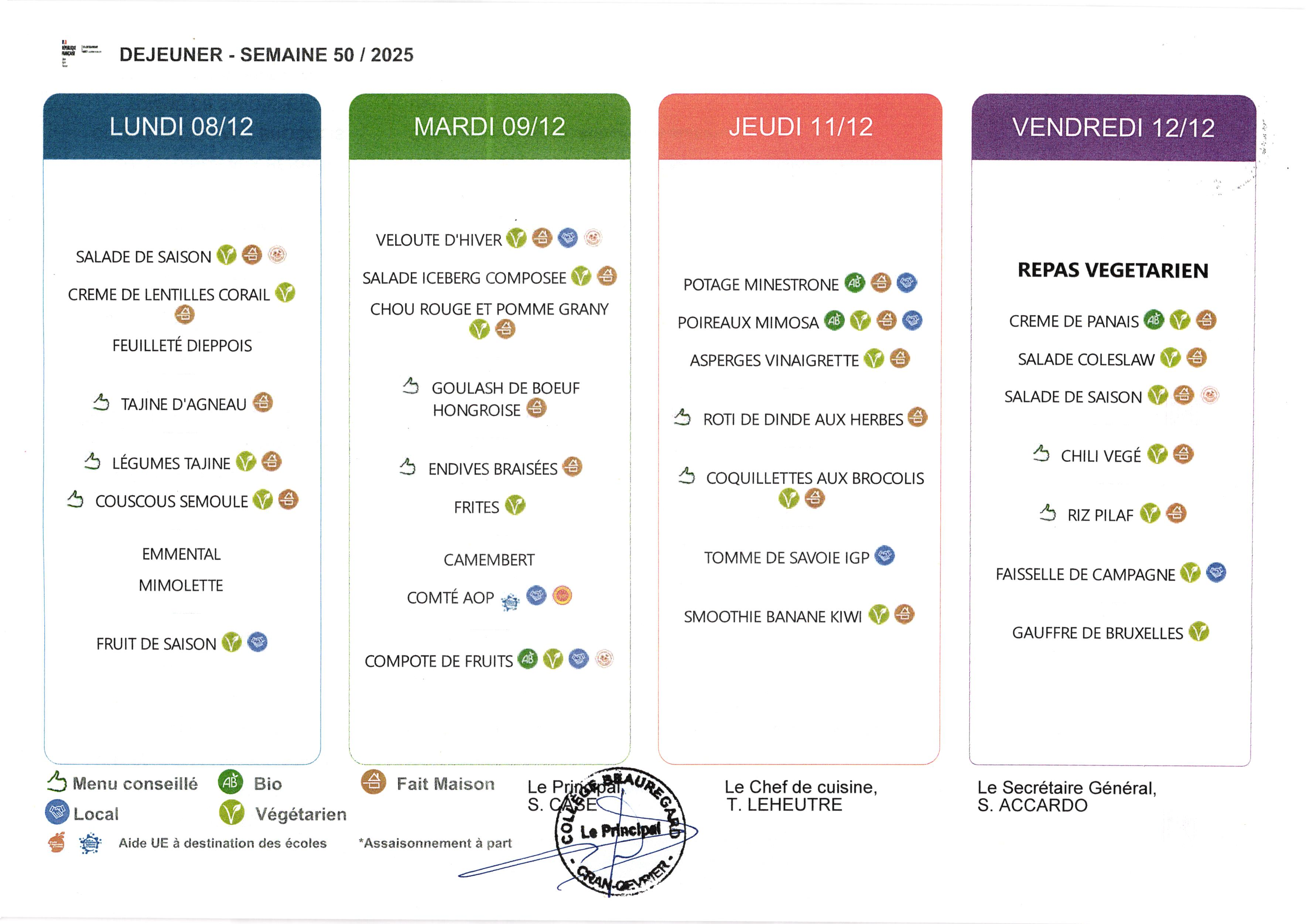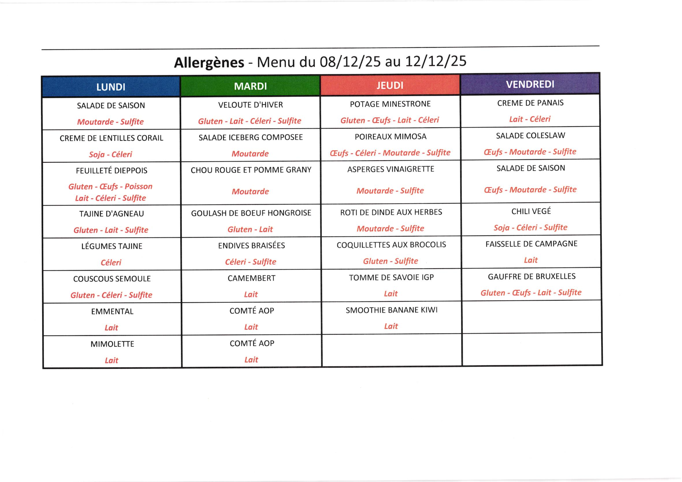 Menu et allergènes Semaine du 08 décembre au 12 décembre 2025