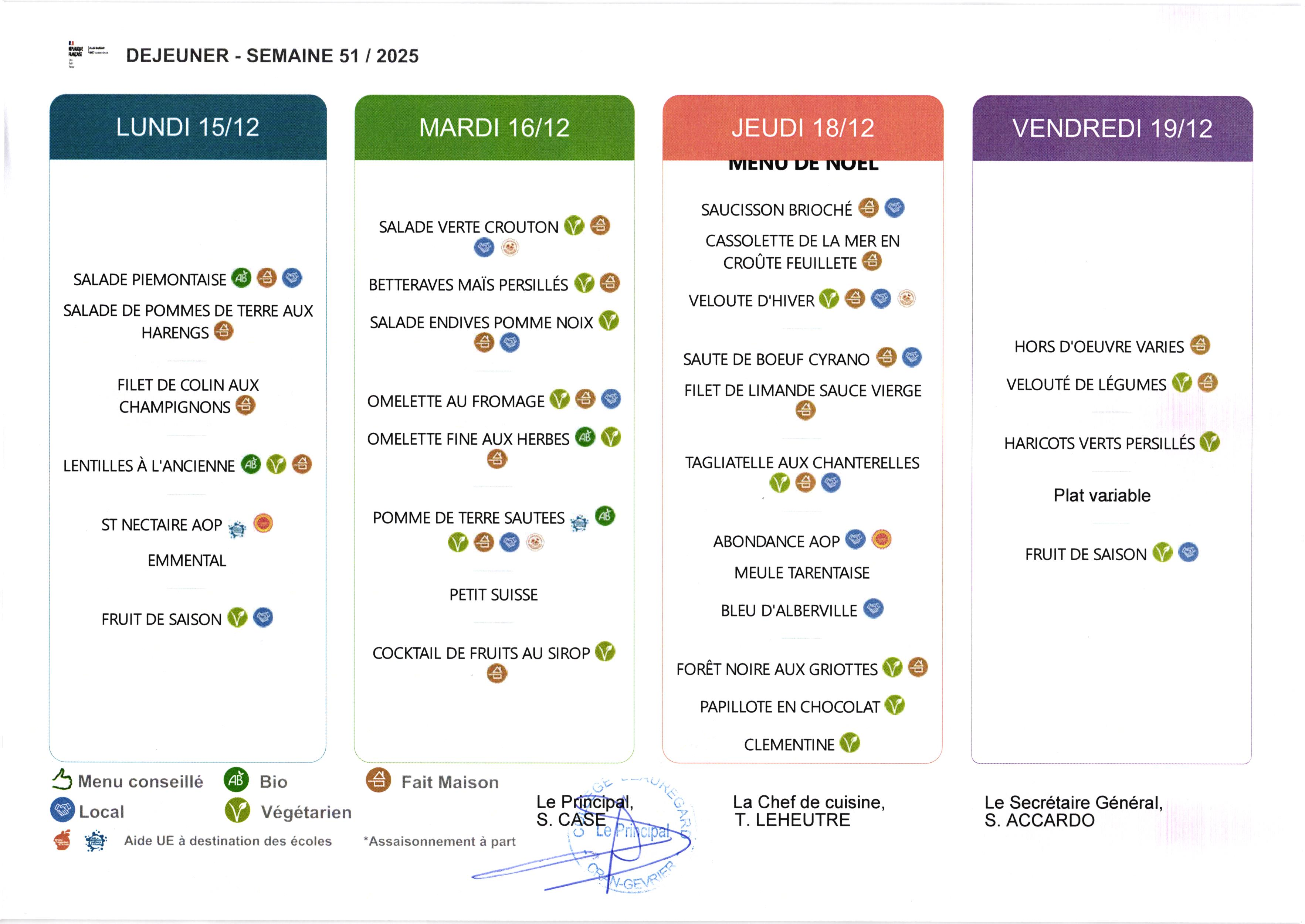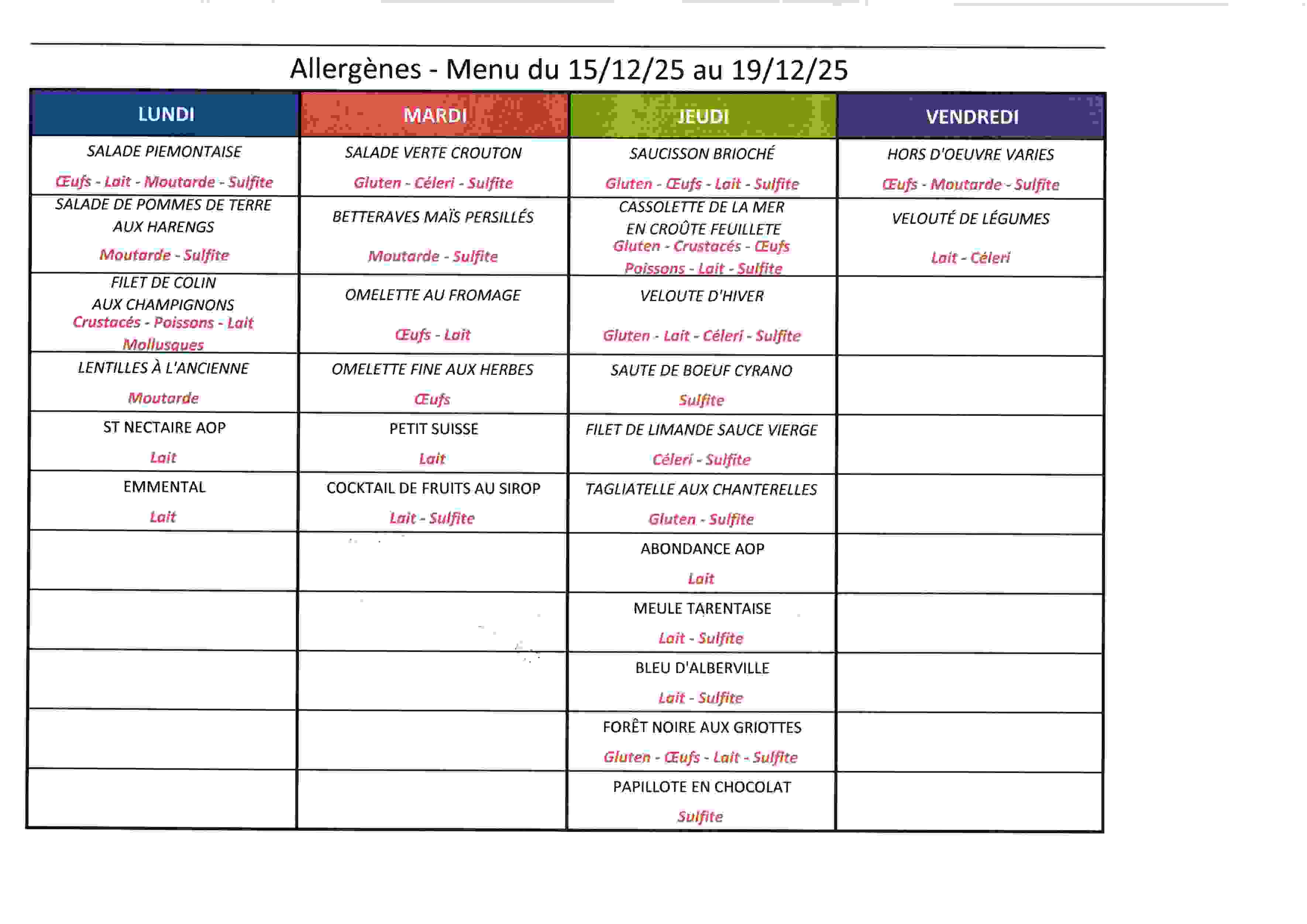 Menu et allergènes Semaine du 15 décembre au 19 décembre 2025