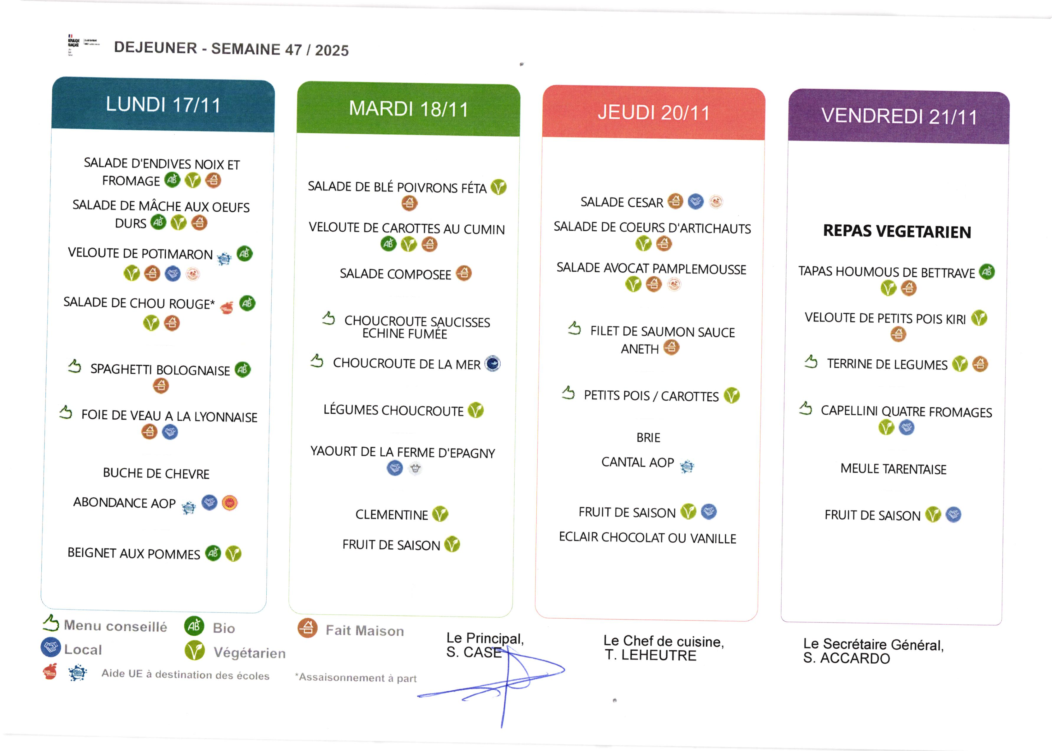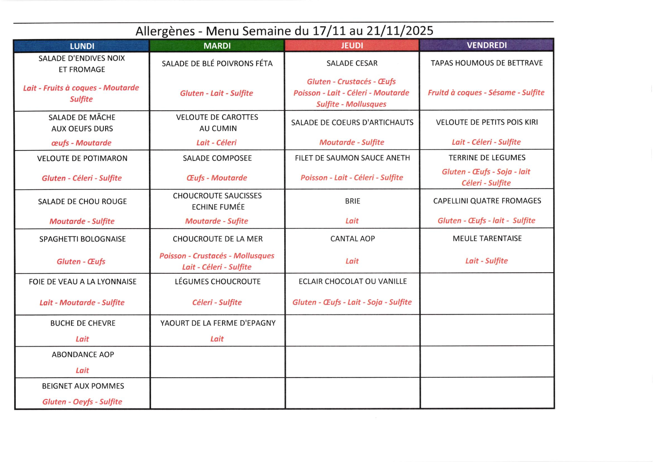 Menu et allergènes Semaine du 17 au 21 novembre 2025
