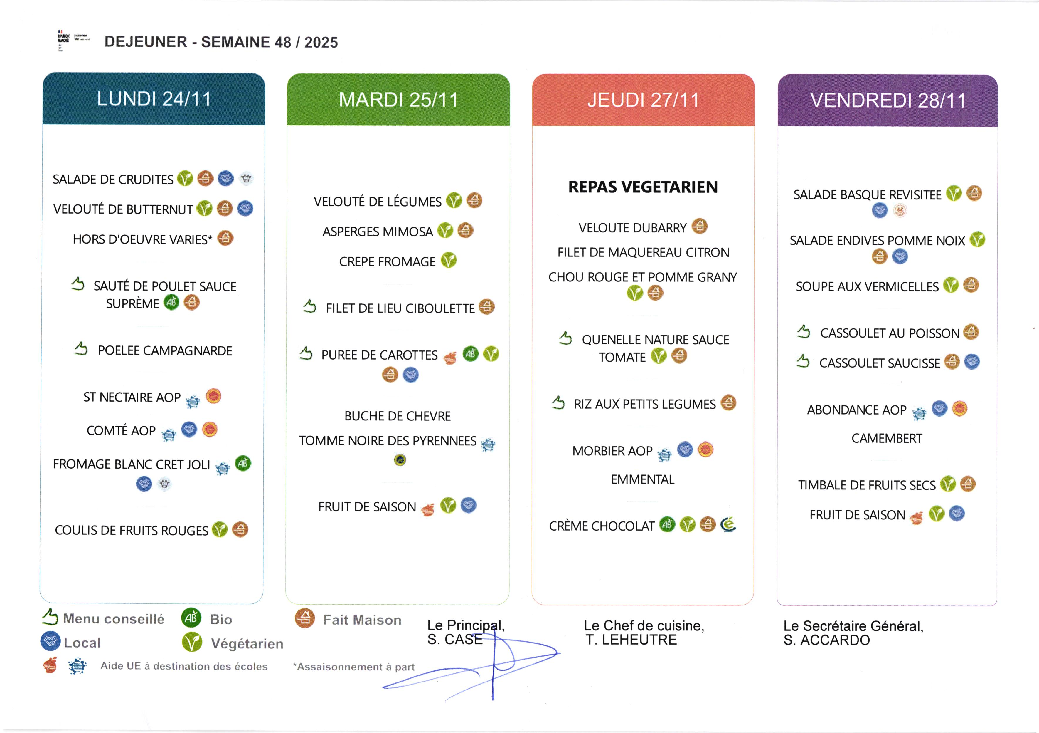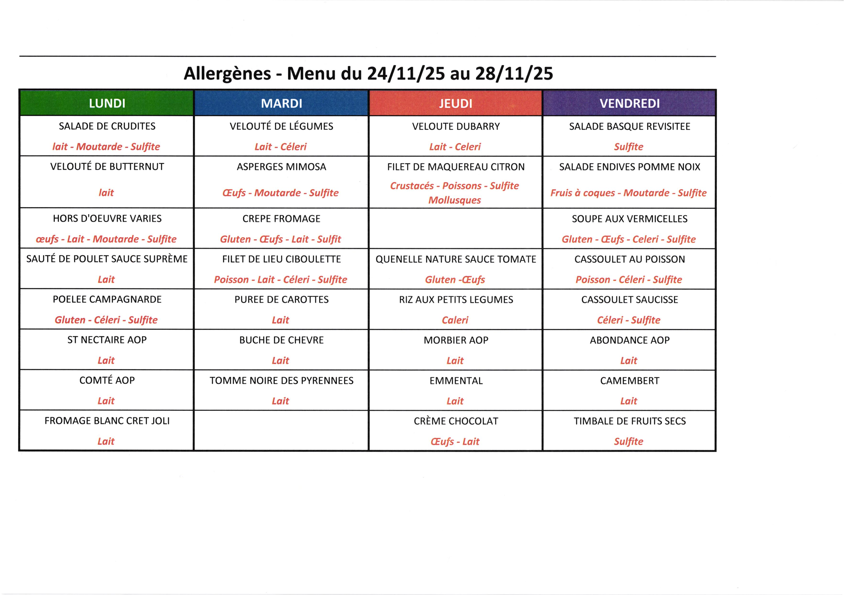 Menu et allergènes Semaine du 24 au 28 novembre 2025